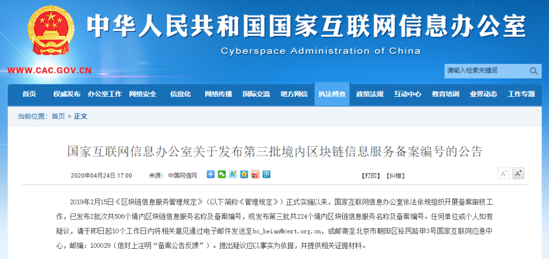 4月24日,国家互联网信息办公室发布第三批境内区块链信息服务备案编号,“中科金财区块链”成功入选。