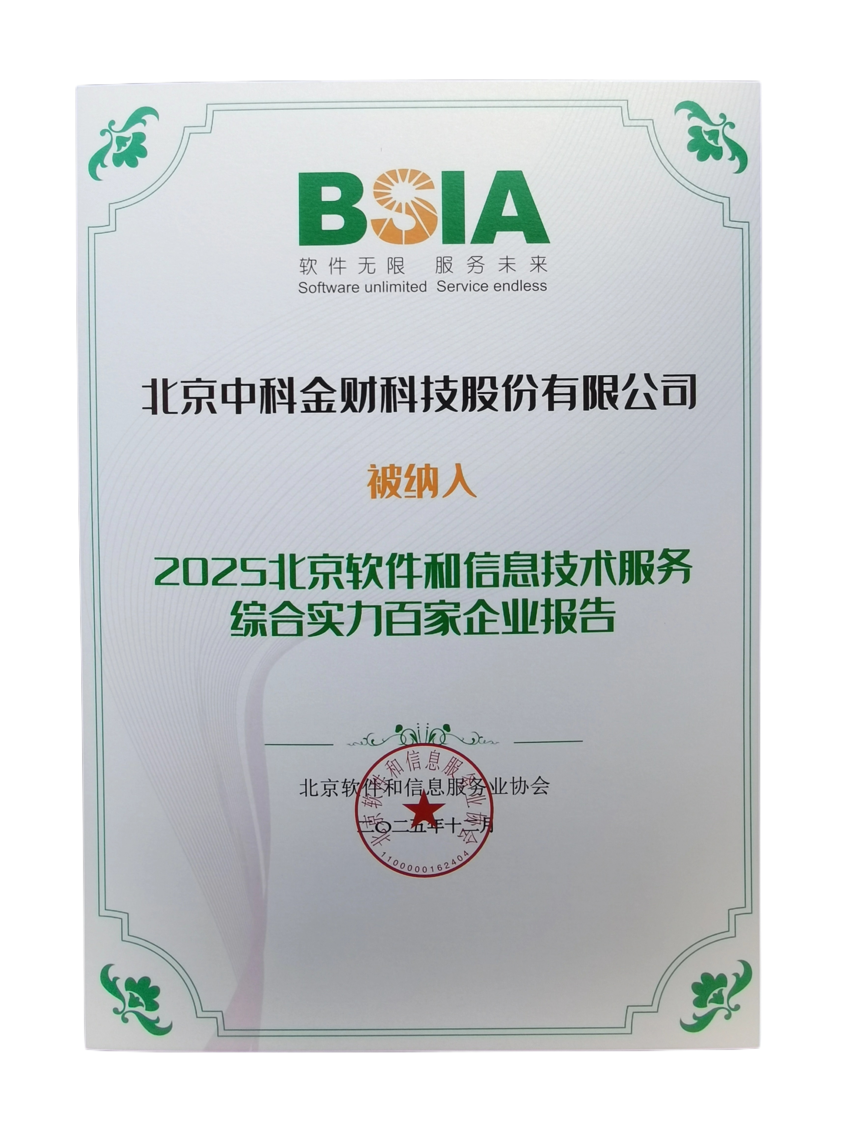 近日,北京软件和信息服务业协会第十一届会员代表大会第三次会议暨2025企业服务年会在京召开,会上发布了《2025北京软件和信息技术服务综合实力百家企业报告》。中科金财凭借强劲的科技创新能力、深厚的数智化综合服务实力,第九次荣登“北京软件和信息技术服务综合实力百家企业”,体现中科金财在软件和信息服务业的领先地位。